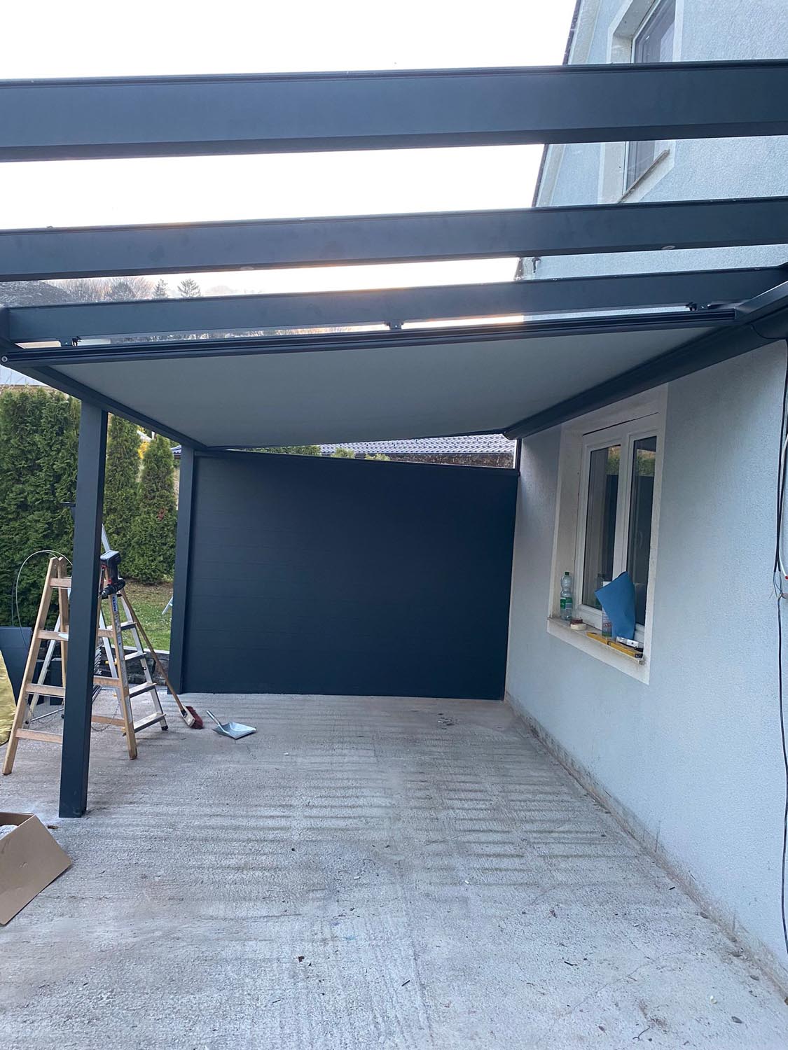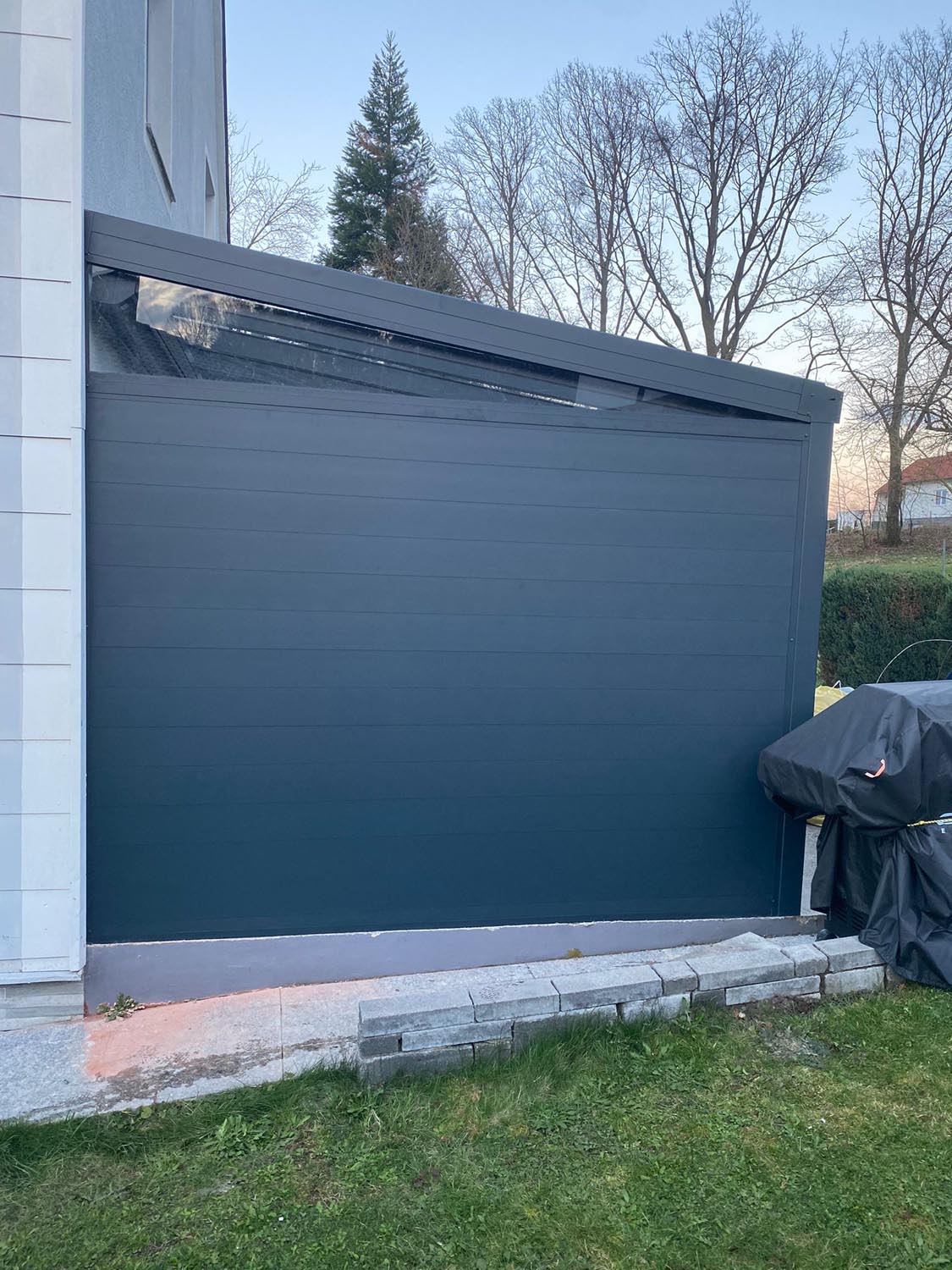 Für Sichtschutz beim Carport bieten wir 125 mm hohe Alupaneele mit 20 mm Luft dazwischen. Die Paneele können individuell angepasst werden. Erhältlich in Holzoptik und Anthrazit.